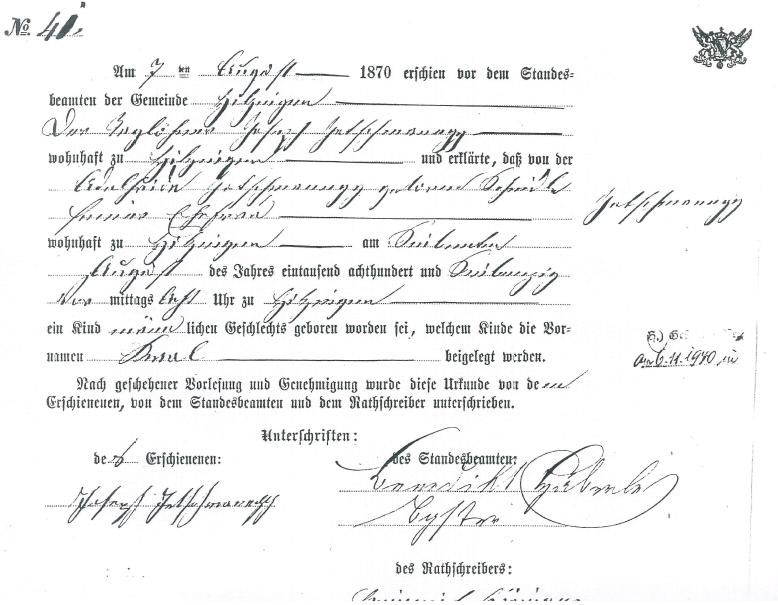 1. Hof / Jetschmanegg, Karl, katholisch (*) Allmendshofen b. Donaueschingen, Baden 05.02.1889, † ? (bei der Hochzeit von Nikolaus als gemeinsames Kind anerkannt)