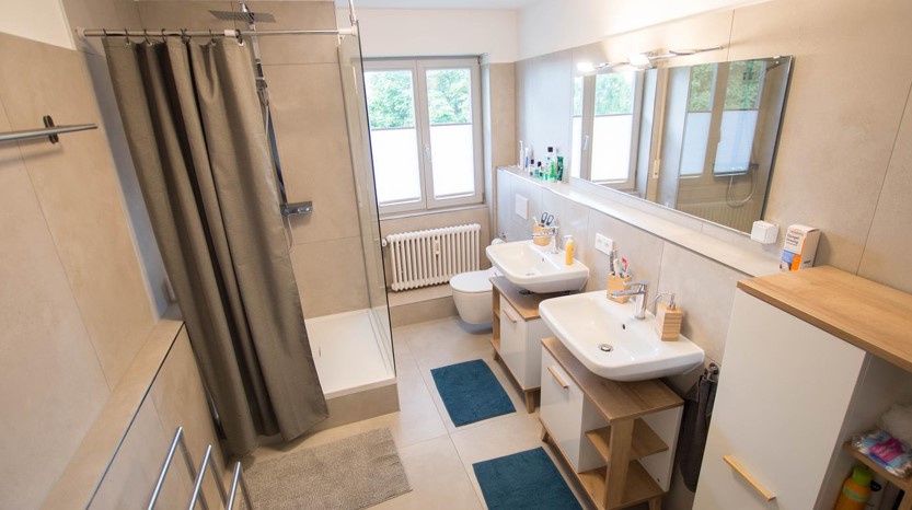 Doppelwaschbecken mit Unterschränken, großer Spiegel mit Beleuchtung,