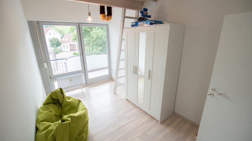 jeweils mit Kleiderschrank, Schlafgalerie mit Matratze und Sitzsack bzw. Sofa.